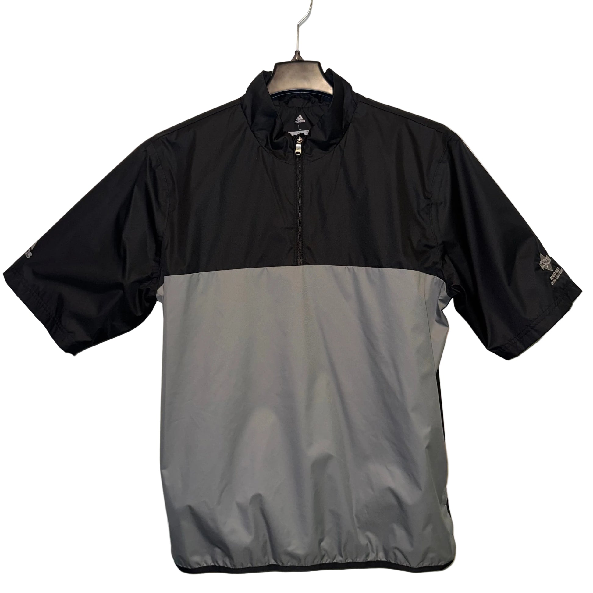 Adidas Golf 1/4 zip windshirt featuring Grand Falls Casino & Golf Resort branding. This preloved piece combines performance-driven design with classic golf aesthetics. The quarter-zip construction allows easy ventilation adjustments during play, while Adidas's technical fabric provides wind resistance and mobility. Ideal for layering on cooler course days or wearing as a standalone piece. A quality addition to any golfer's wardrobe with authentic resort branding.