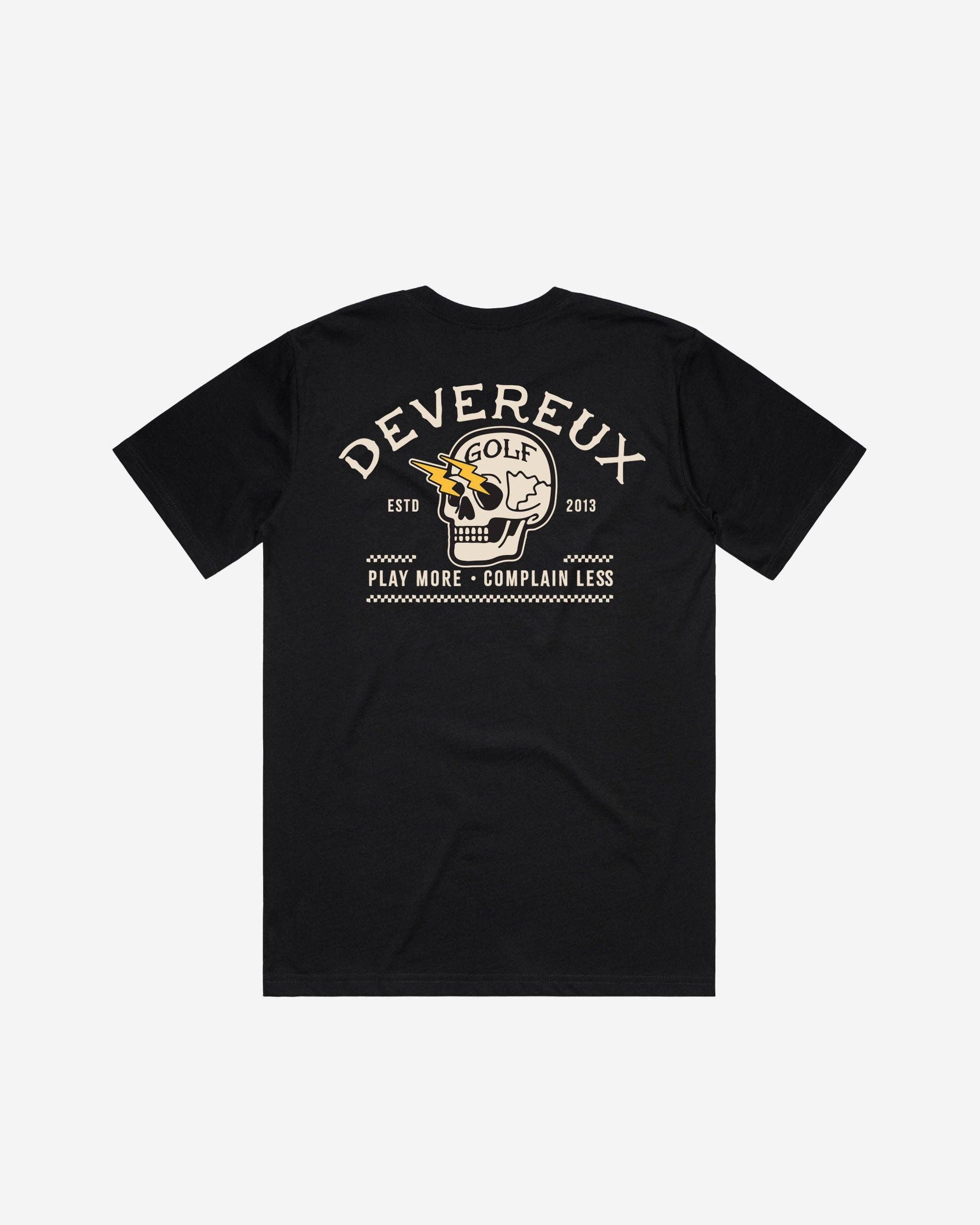 An all-time Devereux bestseller returns, now in a black colorway for the first time. The Shocker Skull Tee blends vintage-inspired graphics with the attitude that helped define our early collections. Built from 100% premium cotton, it delivers the softness, structure, and everyday comfort you want in a go-to tee, whether you're posting up at the range or wearing it off-course. The back graphic features our iconic Shocker Skull with the lightning-bolt eye and bold collegiate arc, paired with the motto “Play More • Complain Less,” a reminder of what golf should feel like.